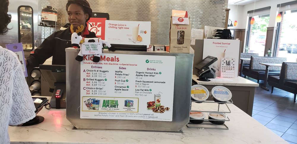 Includes a 1count or 2count of ChickfilA ChicknStrips, a choice of a small Side Item Cinnamon Apple Sauce, Mac Cheese, ChickfilA Waffle Potato Fries, or Fruit Cup, a kids size drink and a special surprise.
